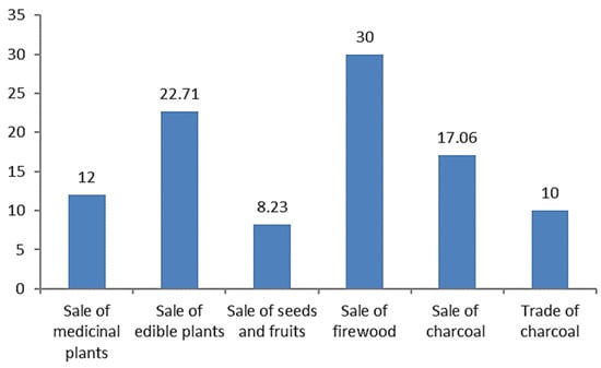 Income from the forest is derived from several products (Figure 4). The sale of firewood is the most frequent source of forest-based household income (30%), followed by the sale of edible plants, which include 14 species, and the sale of medicinal plants, which includes a further seven species. Seeds and fruits include oak, coriander, cumin, hawthorn, and barberry.