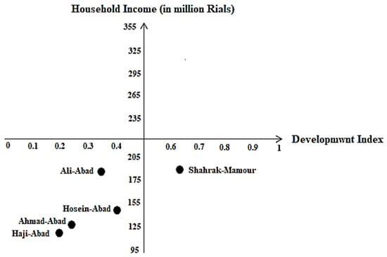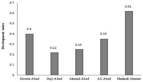Figure 5 shows the development situation in each of the five study villages. The highest level of development (0.62 or moderate level of development) was observed in the village of Shahrak-Mamour. The other four villages were at a low level of development.