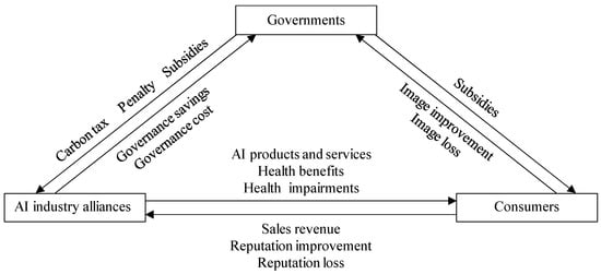 Existing studies suggest that governments [,,], AI industry alliances, including AI device and service supply enterprises [], AI researchers [,,], and consumers [] are the important participants in limiting the AI carbon footprint. Further, some policy proposals for limiting the AI carbon footprint have been proposed. It is clear that governments, AI industry alliances, and consumers will influence one another’s behaviors in the process of limiting the AI carbon footprint. However, the interactions between these three players have not been taken seriously enough by the current literature. The overall aim of this article is to fill this gap in the literature by using a tripartite evolutionary game model, which can be used to quantitatively describe the interactions between these three players.
