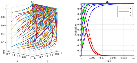 According to the Lyapunov stability condition, the equilibrium points are asymptotically stable when all the eigenvalues of the Jacobian matrix are lower than zero, namely, , and . If at least one of the eigenvalues of the Jacobian matrix is greater than zero, then the equilibrium points are unstable [].