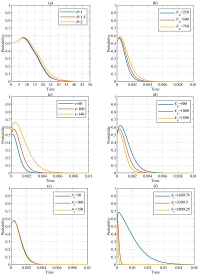 As shown in Figure 3d–f, with the prolonging of time elapsed, all the evolutionary paths gradually converge at the same ESS regardless of the regulatory cost or the subsidies to consumers and AI industry alliances. Meanwhile, the strategy evolution paths take on a tendency to increase first and then decrease regardless of the regulatory cost or the subsidies to consumers and AI industry alliances. Besides, the higher the regulatory cost and the subsidies to consumers and AI industry alliances are, the faster the ESS is reached. The higher the regulatory cost and the subsidies to consumers and AI industry alliances are, the lower the maximum adoption rate of strategy S is achieved. The results indicate that governments are also sensitive to these factors, but these factors can play a negative role in promoting government adoption of strategy S. In addition, the probability that governments adopt strategy S is the highest when the subsidies to consumers are at a low level, but the probability that governments adopt strategy S is the lowest when the subsidies to consumers are at a high level. Therefore, governments are most sensitive to the subsidies to consumers.