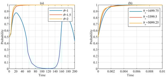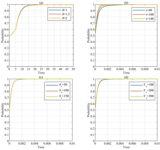 In terms of evolutionary speed, it can be seen in Figure 2b that the speed at which these three players achieve a stable state is different under the initial condition. Whatever the initial values of , , and are, the AI industry alliances will be the first to reach a steady state; then, the governments achieve a stable state, and the speed at which consumers achieve a stable state is the slowest. This indicates that under the initial condition, the speed of adjusting the strategy is the fastest under AI industry alliances, the consumers’ speed of adjusting their strategy is the slowest, and the speed of governments adjusting their strategy is at a medium level.