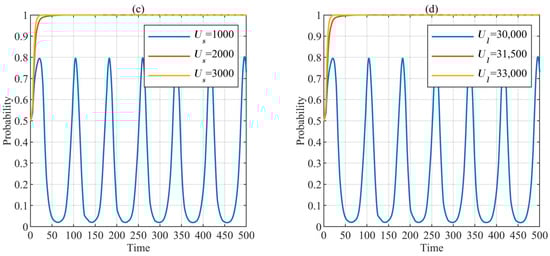 The impacts of key variables on strategy selection of consumers. (a) shows the impact of green consumption tendency on strategy selection of consumers. (b) shows the impact of subsidies on strategy selection of consumers. (c) shows the impact of self-satisfaction on strategy selection of consumers. (d) shows the impact of utility on strategy selection of consumers.