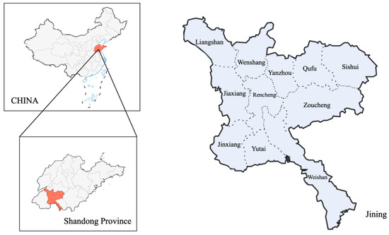 This paper takes Jining City, Shandong Province, as the research area (Figure 1). First, the data collected in the region are representative. From August to November 2022, Jining City continued to have new local cases every month. As of November 2022, there were 12 high-risk areas in Jining City. For high-risk areas, the Jining Municipal Government adopted the corresponding control measures, which comprise data science sampling. Second, the “Zero-COVID” policy adopted by the region fully complies with the guidelines of the Chinese government. These include the prevention and control measures for the home health monitoring of residents in high-risk areas and the continuous collection of monitoring information. During the stay-at-home monitoring period, the movement of quarantined individuals was restricted [18]. Third, the geographic and cultural characteristics of the region are typical. Jining City is located in the central part of Shandong Province on the North China Plain, and its economic operation is relatively stable. It is a transportation hub city. The population of Jining City is generally stable, with a permanent population of 8.337 million, including 3.235 million in rural areas [19]. Therefore, it is representative to choose this area for research.