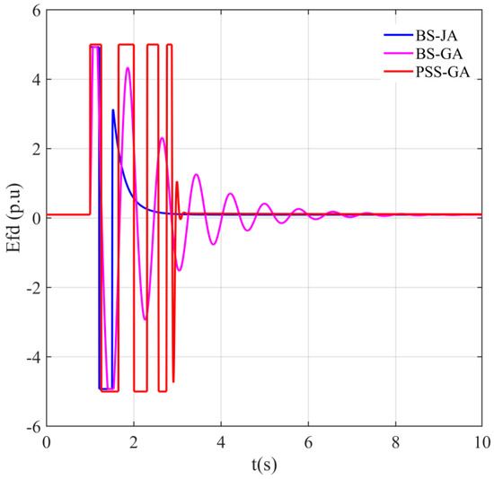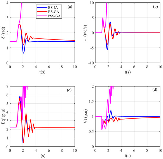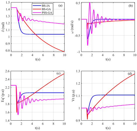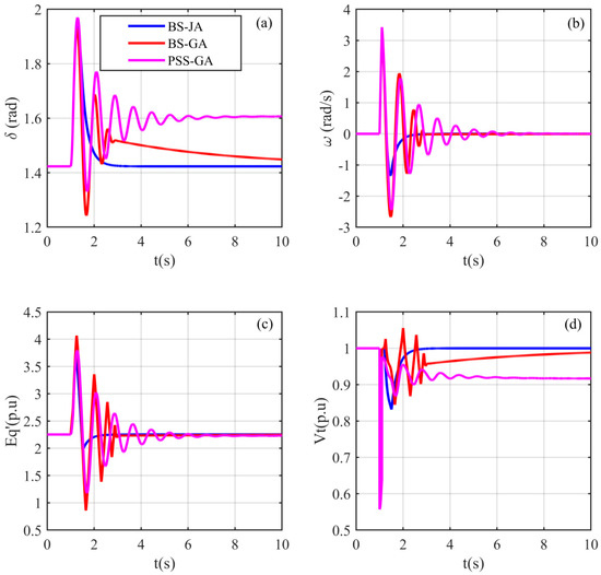 To further show the robustness and superiority of the BS-JA compared to PSS-GA and JA-PSS, the amplitude of the first overshoots (D1), the settling time, and the steady state error were calculated for the system state variables and the terminal voltage. The obtained results are shown in Table 4. This table indicates that the proposed BS-JA controller had the lowest amplitude of the first overshoots and the settling time, compared to the other controllers. Moreover, the BS-JA managed to eliminate the steady state error (static error), which represented the difference between the desired quantity and the instantaneous quantity, in the steady-state operation, for all of the state variables (), where the desired quantities are defined as: , , and .