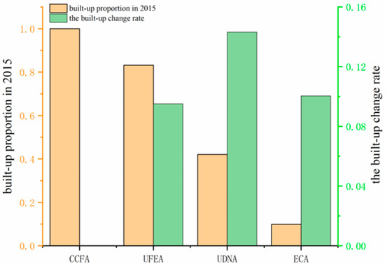 Extracting transition rules for LULC is an important component of the PLUS model. However, due to the different degrees of urbanization, the transition rules for LULC changes in different regions are inconsistent. Different urban functional areas in Beijing show different levels of urbanization. Then, we have selected the percentage of built-up land in Beijing in 2015 and the rate of change in built-up land from 2015 to 2020 as two indicators to characterize the differences in the degree of urbanization (Figure 3). Because the coverage of built-up land can reflect the level of urban development, the rate of change in built-up land reflects the speed of future urban development in different regions. CCFA has a very high proportion of construction land, and its rate of change is almost zero. UFEA has a relatively high proportion of construction land, but the rate of change is low. Although UDNA and ECA have different proportions and rates of change of construction land, both exhibit a low coverage-high change pattern. Therefore, when simulating LULC, it is necessary to consider the difference in urbanization degree and use different rules to improve the simulation accuracy. At the same time, due to the small area of CCFA and its construction land, we have merged the area of CCFA into UFEA.