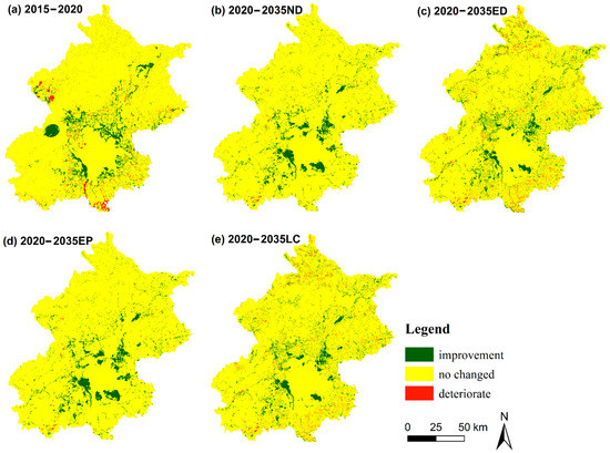 To study the change in habitat quality, we subtracted the habitat quality map in the later study period (2035) from the previous study period (2015) to obtain the habitat quality change map of Beijing from 2015 to 2035 (Figure 6) and calculated the changing area (Figure 7). Most of the habitat quality in Beijing has not changed, and the improved areas are mainly concentrated in the surrounding areas of the urban center, which is caused by the transformation from built-up land to grassland. The regional distribution of deterioration is scattered. The scenario with the largest habitat quality improvement is the EP scenario, and the area that exhibited habitat quality improvement from 2020 to 2035 accounts for 19.3% of the total. The second is the 2035 LC scenario, with the proportion of improved areas reaching 18.5%. This shows that ecological protection can improve the quality of habitats.