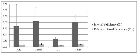 In order to assess the deficiency in the quality scores relative to the average, a relative internal deficiency (RDI) is also calculated (Equation (6)):
