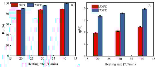 Figure 1 shows the results of RE value and η value at different heating rates for the runs made in a series of tests. The results show that a higher heating rate led to a higher RE of PAC, Figure 1a. For two certain regeneration temperatures, 500 °C and 700 °C, when the heating rate changed from 20 °C min−1 to 40 °C min−1, the related RE values increased from 86.82% to 89.16% and from 90.22% to 99.88%. The findings demonstrate that the desorption of 4-CP from PAC is facilitated by an increase in heating rate at 700 °C. The 4-CP molecules are easy to desorb from the pores of PAC due to rapid thermal decomposition during the process of a rapid temperature rise stage. Figure 1b exhibits the value of η at various heating rates. The value of η was remarkably increased with the improvement in heating rate. For example, η was 7.7% for 20 °C min−1, after which it increased to 9.7% for 40 °C min−1 at a temperature of 500 °C. The value of η at 500 °C is significantly lower than that at 700 °C. These results are due to the fact that a faster heating rate increases energy transfer and also reduces the time spent in residence by gases, which causes the desorption of the byproducts to degrade. At high temperatures, the decomposition of organics is accelerated and some small molecular substances are produced; additionally, some PAC is carbonized. Thus, the value of η increases.