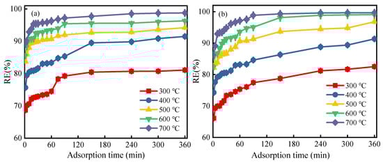 The influence of regeneration temperature was investigated between 300 and 700 °C. Figure S1 displays the effect of regeneration temperature on the RE value at regeneration times of 30 min and 60 min. As observed, the RE value was significantly promoted with a higher regeneration temperature. The RE increased from 63.89% to 85.91% and 78.60% to 90.54% as the regeneration temperature was raised from 300 to 700 °C, respectively. The activation energy for the carbon–steam reaction would typically decline with an improvement in regeneration temperature, resulting in a promotion in reaction rate and a higher RE value. The adsorption process of 4-CP on PAC is mainly chemical adsorption. With the increase in regeneration temperature, the corresponding chemical bonds between 4-CP and PAC’s surface functional groups break. The results that appear here were consistent with trends that are frequently observed during pyrolysis procedures. At a higher temperature, the 4-CP molecules are pyrolyzed to produce small molecular compounds. The small molecular compounds are easy to volatilize and desorb from PAC, which further improved the regeneration rate of PAC. In the same way that a high temperature promoted the expansion of pore structure [20], it also accelerated the cracking processes of the chemisorbed percentage for exhausted carbons. Márquez et al. reported that thermal regeneration at temperatures no higher than 350 °C can be a simple and sustainable alternative to recover GAC used in WWTPs, with regeneration efficiencies reaching (72–98%) [18].