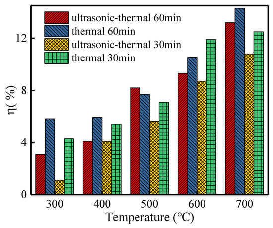 Figure 3 illustrated the weight loss percentage (η, %) of various regeneration methods. Obviously, an improvement in the regeneration temperature would facilitate the value of η. It should be noted that the values of η for ultrasonic–thermal treatment after 30 min and 60 min were both lower than that for single thermal regeneration. For example, when under the temperature of 500 °C and regenerated for 30 min, the value of η for the ultrasonic–thermal process decreased by 21.13% compared with single thermal regeneration. The results above demonstrate that ultrasonic–thermal combined regeneration can markedly reduce the weight loss of PAC, and energy consumption for heating can also be reduced. This can be explained by the following reasons: (i) The turbulence and shock wave generated by ultrasound cavitation accelerated the mass transfer process among the solid surface of PAC and the liquid phase, which is the main mechanism of heterogeneous acoustic chemical reactions [30]. (ii) The mechanical effect and cavitation effect of ultrasound cleared the pores blocked in the saturated PAC [31,32,33], which created superior regeneration conditions for the following thermal desorption, reducing the weight loss of PAC.