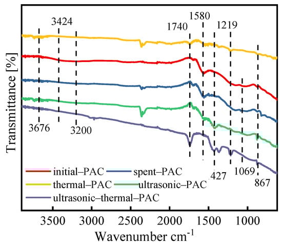 The spectra of FTIR for initial, exhausted and various regenerated PAC tests are represented in Figure 4. Various sources published the assignments of the respective functional groupings [19,34,35,36]. For the initial-PAC, the O–H stretching vibrations of the hydroxyl groups in phenols, alcohols and carboxylic acids are responsible for an absorption peak at 3200 cm−1. This peak disappeared after three regeneration process, illustrating that during the regeneration process, the O–H band was broken. The broad band between 3676 to 3424 cm−1 indicates the presence of H–O–H, which is correlated with the presence of water molecules on the PAC surface. There are noticeable distinctions in sample peak location. As for the ultrasonic–thermal–PAC, the peaks were various. The location at 1740 cm−1 was recognized to indicate the existence of C=O stretching in carboxyl. Compared to the ultrasonic–PAC and thermal–PAC, the peak at 1740 cm−1 was weakened. We speculate that the C=O group in carboxyl was produced during the thermal combined ultrasonic process. The band that exists at 1580 cm−1 is notable due to the fact that it is connected to C=O vibrations in aromatic rings and carbonyl compounds. The aromatic C=C stretches in phenyl were related to the peak at 1427 cm−1. The above spectral differences are caused by differences in temperature. However, despite this difference, many inflections or peaks can be observed in different spectra, suggesting differences in the desorption of various molecular species caused by ultrasonic effects, not only temperature. Peaks around 1219 cm−1 and 867 cm−1 were attributed to the stretching of C–O groups in phenol and Ar–H out-of-plane bending in phenyl groups, respectively. The peak at 1069 cm−1 is associated with the out-of-plane bending of aromatic C–H bonds. It should be noted that the average spectrum of Thermal-PAC was narrow compared to all samples, which demonstrates that thermal treatment mainly contributed to the physical desorption of 4-CP. The declines in surface-oxygen-containing groups were not conducive to improvement in adsorption capacity for regenerated PAC. This result is also consistent with the findings reported by Lim [37].