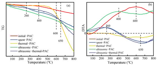The TG and DTA trends from the thermogravimetric determination of PACs under different regeneration methods are displayed in Figure 5. As shown in Figure 5a, the thermal regeneration processes for various PACs are primarily separated into four separate phases: (i) the evaporation of water (under 150 °C); (ii) the pyrolyzation of small molecules on the PAC (150–260 °C); (iii) the elimination of the predominantly physically adsorbed substances from PACs (260–600 °C); (iv) the degradation of chemically adsorbed pollutants on PACs and the breaking of the chemical bonds of surface oxygen functional groups (at temperatures over 600 °C) [38]. In other researchers’ reports, temperatures ranging from 40 to 200 °C were related to the desorption of weakly bonded water molecules adsorbed on the adsorbent [35]. Additional results show that temperatures of 250–350 °C are conducive to the oxidation and/or decomposition of chemical compounds strongly adsorbed in small pores [18]. Thus, for various adsorbates, the temperature for desorption was slightly different. The findings from Figure 5b show that there were noticeable variations in the DTA lines of the PACs, particularly in the third and fourth phases of the heating procedure. Regarding the DTA curve of the ultrasonic–thermal–PAC, there was an identifiable peak at 260 °C, but for the DTA curves of other regenerated PACs, there were no obvious peaks. This is due to the release of water vapor or the decomposition of other volatile substances on PAC. Another investigation also reported that in the chemical regeneration of spent PAC, the wide peak at temperatures above 650 °C may be due to the decomposition of surface functionalities [39]. The corresponding TG curve (Figure 5a) of ultrasonic–thermal–PAC decreased slowly as the PAC weight loss gradually increased. As reported, ultrasound would influence the surface functional groups of PAC, and functional groups such as C=O and O–H appeared after ultrasound regeneration [26]. This difference suggests that ultrasound treatment might weaken both physical interactions such as the Van der Waals force and the hydrogen bonding interaction between 4-CP molecules and the surface of PAC, which makes 4-CP easily desorbed by ultrasonic treatment and the following heat regeneration. It was observed that a peak emerged in the DTA curve of the ultrasonic–PAC between 260 and 650 °C, and a peak appeared in that of the thermal–PAC between 500 and 700 °C. Considering that the former peak was broader than the latter, it seems probable that there is no obvious separation between the third step and the fourth phase of the ultrasonic–PAC heating process. For the thermal–PAC, the TG curve displays a considerable drop in the 400 °C to 800 °C temperature range, with a weight loss of 30.73%. This indicates that only thermal regeneration results in a high degree of PAC weight loss.