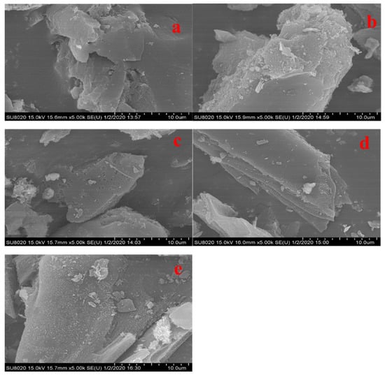 SEM of PACs with initial–PAC (a), spent–PAC (b), thermal–PAC (c), ultrasonic–PAC (d), and ultrasonic–thermal regeneration–PAC (e) (magnification 5000 times).