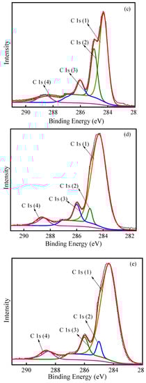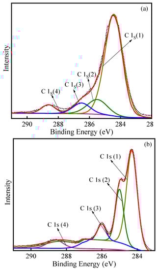 XPS spectra were used to study the elemental composition of the various regeneration treatments in more detail. The total survey spectra are presented (Figure S3); C and O could be detected. The obtained spectra were calibrated according to the C 1s peak (284.8 eV). The complex envelope in the high-resolution XPS spectra of the C 1s excitation suggests that several other carbon species were present on the surface of the PACs. The detailed scans of C 1s are displayed in Figure 7. Four signals used in the analysis of carbon material were included in the C 1s photoelectron spectrum of PAC [40,41,42]. The components were attributed to graphitic C atoms (C 1s (1)) [43], carbon entities in alcohol, ether groups and/or C–O–Cl bonds (C 1s(2), R–OH, C–O–C, C–O–Cl), carbon in hydroxyl groups (C 1s(3), C–OH), and carboxyl and/or ester groups (C 1s(4), O=C–OH, –C(O)–O–C) [43,44]. As can be seen from Figure 7, various regeneration processes produced different groups of C 1s. For thermal–PAC, the content of graphite carbon (area of peak C 1s (1)) decreased while the content of oxygenated carbon (area of peak C 1s (2)) increased, indicating some of the C was oxidized. For ultrasonic-PAC, the intensity of hydroxyl groups (area of peak C 1s (3)) increased, illustrating that ultrasound accelerated the generation of C–OH groups. Moreover, peak positions for the ultrasonic-PAC and ultrasonic–thermal–PAC were not significantly different, namely, the types of surface C 1s components were similar.