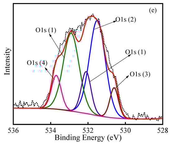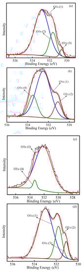 The detailed scans of O 1s for various PACs are shown in Figure 8. The O 1s peaks were deconvoluted into 3–5 parts for the PACs. The O 1s (1) peak at 532.1–532.9 eV is attributed to singly bonded oxygen (–O–) in C–O [40,43]. The O 1s (2) peak at 531.1–531.5 eV is ascribed to –OH groups. The double bond connecting oxygen and carbon (C=O) in carbonyl and/or carboxyl is responsible for the O 1s (3) peak at 530.6–530.9 eV [45]. Moreover, the O 1s (4) peak at 533.3–533.6 eV is responsible for the chemisorbed oxygen and water. Obviously, there were differences in the oxygen forms of the PACs after various regeneration methods. The existence of various chemical states of oxygen is represented by the wide O 1s peaks. After thermal regeneration, the state of oxygen mainly was –O– in C–O. When the saturated PAC experienced ultrasonic irradiation, the states of oxygen mainly were C–O, –OH and double-bonded oxygen. In addition, for the ultrasonic–thermal–PAC, the form of oxygen mostly was double-bonded to carbon (C=O) in carbonyl and/or carboxyl, –OH groups and C–O. As presented in the XPS spectra, the oxygenous groups increased on the surface of the ultrasonic–thermal regenerated PAC. These oxygenous groups may affect the adsorption performance of the regenerated PAC and the subsequent adsorption–regeneration process.