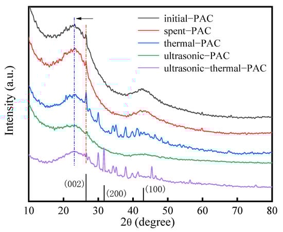 XRD analysis was applied to explore the crystalline structure of several regenerated PACs, with outcomes recorded in Figure 9. We observed that the XRD peaks of the PACs were different after their regeneration processes. For all samples, the XRD diffraction peak of C (002) at 26.5° indicates a graphite structure for the carbon material [18,19,46,47,48], while a peak at 23.1° indicates amorphous carbon. The initial–PAC and spent–PAC displayed a wide and relatively high-intensity signal at 43° (100), which is assigned to the overlapped plane of graphite (PDF #41–1487) [18]. For ultrasonic–thermal–PAC, the peak at 31.7° (200) was related to carbon oxide (CO) and matched well with the standard card of PDF#74-1229. After the three regeneration treatments, the overlapped plane of graphite was significantly less present, demonstrating that the graphite structure of carbon can be slightly destroyed by both thermal regeneration and ultrasonic regeneration. In addition, the results show that the signal intensity of amorphous carbon with low crystallinity decreased, indicating that the effect of ultrasound and pyrolysis processes changed the crystal structure characteristics of the obtained carbons.
