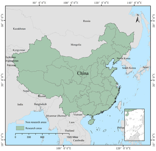Situated in East Asia, China spans from 73°40 to 135°2 east longitude and 3°52 to 53°33 north latitude, encompassing a diverse array of climates and abundant natural resources (Figure 1). China’s agriculture provides a supply of staple foods for approximately 22% of the global population, establishing itself as one of the world’s largest food producers and consumers [39]. Investigating agricultural sustainability in China offers valuable insights that contribute to advancing research and practice in global sustainable agriculture.