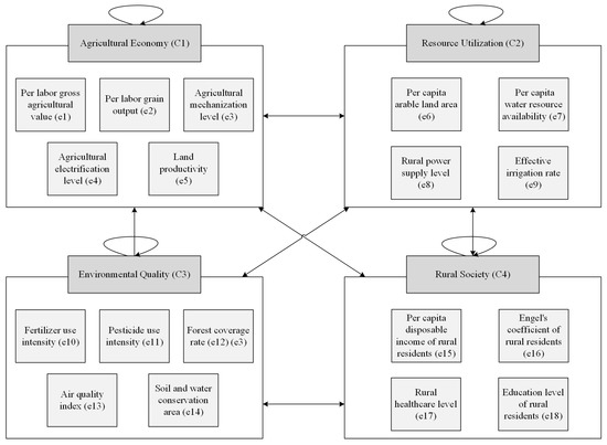 The ANP network structure is divided into control and network layers. The control layer determines the system’s general objective and the corresponding criterion, while the construction of the relationship between the network layer elements is the core of the ANP method. In this study, the control layer has only one element, agricultural sustainability, and thus was omitted. The network layer is constructed using the previous agricultural sustainability evaluation index system. The clusters in the network layer and the nodes under each cluster correspond to the four dimensions and indicators of the agricultural economy, resource use, environmental quality, and rural society in the evaluation system (Table 1), respectively.