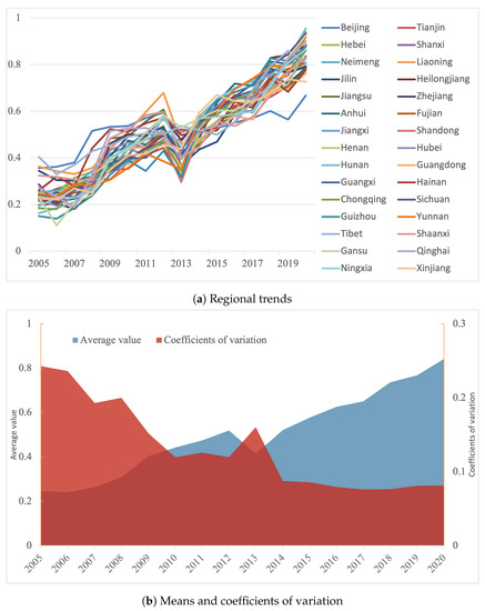As indicated by Figure 4b, the average agricultural sustainability levels of Chinese provinces exhibit a rapid growth trend, rising from 0.2464 in 2005 to 0.8407 in 2020. This upward trajectory was interrupted by fluctuations in 2012 and 2013 when the average value declined to 0.416 before rebounding to 0.518. On the other hand, the coefficient of variation displays a more complex pattern. Initially, the values showed a pronounced decrease; however, this trend was disrupted by a notable increase in 2013, with the coefficient reaching its peak at 0.160. Following this apex, the coefficient gradually declined, stabilizing in 2019 and 2020. The trends in mean values and CVs indicate that while the agricultural sustainability capacities of Chinese provinces have been rapidly improving, there is a convergence effect of low-efficiency regions catching up with high-efficiency regions.