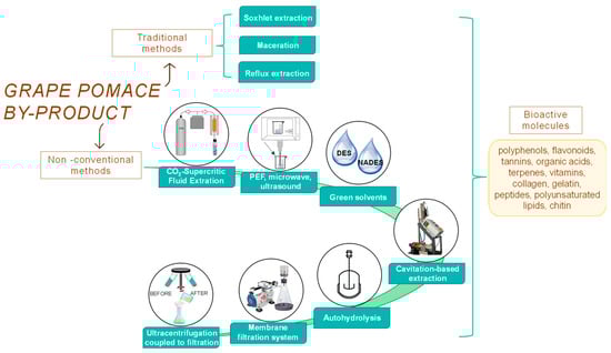 An overview of grape pomace extraction with different methodologies and derived bioactive molecules.