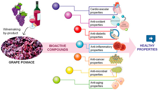 Grapes, particularly the species Vitis vinifera L., are one of the most widely grown crops in the world. Winemaking processes generate a high amount of residues, which currently pose an environmental and economic sustainability problem for companies in the sector. For this reason, solutions are being explored for the development of new products with high-added value derived from the valorization of these residues. One of the wastes produced by winemaking processes is grape pomace, which chemical composition is promising because it is rich in compounds with high antioxidant activity, such as polyphenols (anthocyanins, flavonols, flavan-3-ols, procyanidins), phenolic acids, resveratrol, and fiber. Commonly grape pomace is used to produce distillates and to extract tartaric acid and coloring substances such as enocyanin. Recently, alternative uses of grape pomace have been adopted, such as the production of extracts with antioxidant properties, fermentation substrates, composting and biomass for energy production, and fiber extraction for the development of high-value-added products enriched with bioactive molecules from grape pomace. Here, we discuss how bioactive molecules from grape pomace are involved in various human biological functions and their applications in the agri-food sector.