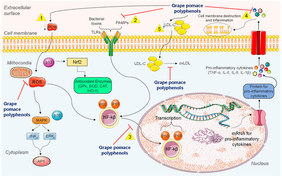 Effects of grape pomace polyphenols. (1) Polyphenols reduce the production of ROS. ROS diffused in the cell or exploded from mitochondria stimulate the activation of MAPKs, NF-κβ MAPKs, and NF-κβ determine the inflammatory transcription factor characteristics of pro-inflammatory mediators. Transcription of antioxidant enzymes is determined by the dissociation of Nrf2. (2) Polyphenols inhibit the activation of TLRs by bacterial toxins and PAMPs, which in turn activates NF-κβ. (3) polyphenols inhibit the NF-κβ pathway leading to the release of pro-inflammatory cytokines, which (4) cause cell membrane destruction and inflammation. (5) Polyphenols reduce LDL-C levels and the formation of oxLDL. Arrows indicate activation, and perpendicular lines indicate inhibition. Blu arrows indicate a decrease. Abbreviations: AP1, activator protein 1; CAT, catalase; ERK, extracellular-signal-regulated kinase; GPx, glutathione peroxidase; HO-1 heme oxygenase 1; IL-1β, interleukin-1β; IL-6, interleukin-6; IL-8 interleukin-8; JNK, c-Jun N-terminal kinases; LDL-C, low-density lipoprotein cholesterol; MAPK, mitogen-activated protein kinases; NF-κβ, nuclear factor κ light chain enhancer of activated B cells; Nrf2, nuclear factor erythroid 2 related factor 2; oxLDL, Oxidized LDL; PAMPs, pathogen-associated molecular patterns; ROS, reactive oxygen species; SOD, superoxide dismutase; TLRs, Toll-like receptors; TNF-α, tumor necrosis factor-α.