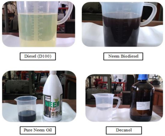 The neem oil and NOME were purchased from SVM Agro Processor, Maharashtra, India. Diesel and decanol were purchased by Thermo Fischer Ltd., India, and IOCL, India, respectively. The fatty acid composition of neem biodiesel by GCMS in accordance with IS 548 standards is shown in Table 1. The parent fuel samples used to make quaternary blends are depicted in Figure 1.