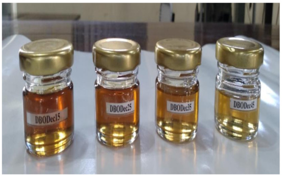 The quaternary blends were made by blending NOME, neem oil, decanol, and diesel in various volumetric proportions by splash blending and with the help of a magnetic stirrer. The various quaternary blends prepared are DBODec15, DBODec25, DBODec35, and DBODec45, in which diesel and neem oil contents were maintained at 40% and 5%, respectively. The decanol concentration was varied at 15%, 25%, 35%, and 45%, and the biodiesel quantity was increased to 10%, 20%, 30%, and 40%. The quaternary blends were maintained at the ambient temperature of 300 K; therefore, no phase separation was noticed for 95 h prior to their fueling in the CI engine. Each set of experiments required four (4) liters of quaternary blended sample to obtain a stable reading of the engine performance and exhaust emissions. The quaternary blends are depicted in Figure 2.