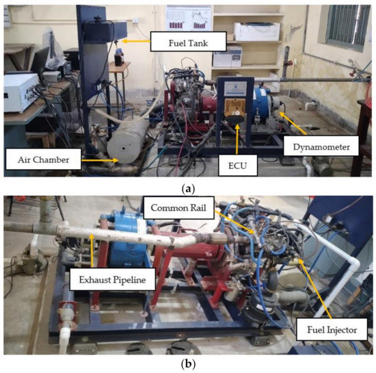 (a) The CRDI diesel engine set-up. (b) A closed view of CRDI diesel engine.