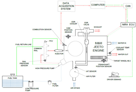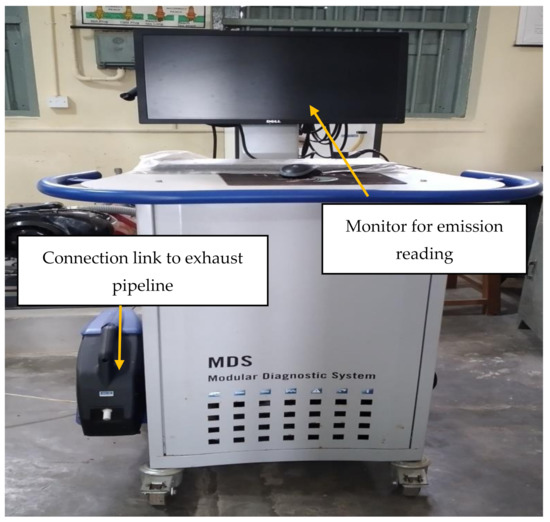The research was conducted on a CRDI CI engine, as shown in Figure 3a,b. The CRDI diesel engine was connected with Data Acquisition System (DAS)(Medhavi, Ambala, Haryana, India). The speed and load controllers were used to change the speed and load. An ECU (Electronic Control Unit) was incorporated with the engine and was used for the data exchange between the user and the software. The schematic diagram of the engine is depicted in Figure 4, and its product details are mentioned in Table 4. The details of the dynamometer are given in the Table 5. The engine working condition was recorded by sensors, and the concentration of exhaust emissions was measured by AVL exhaust machine (Modular Diagnostic System), depicted in Figure 5.