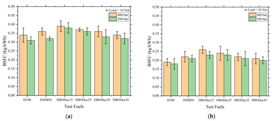 The effects of IP on the BSFC of a CRDI diesel engine at various loads are depicted in Figure 6a,b. The BSFC was reduced with an increment in IP at both the loads. The increase in the IP caused uniform fuel distribution and better combustion. The quaternary blends led to comparatively higher BSFC than diesel. This was because of the lower calorific value of the quaternary blends compared to diesel. However, contrary results were shown by the work of Saridemir et al. [23]. At 400 bar and 10 Nm, the minimum BSFC was noted for DBODec45, which was only 2.94% higher as compared to diesel. The highest decanol content in DBODec45 provided more oxygen molecules available for enhanced combustion. The highest BSFC was obtained for DBODec15, which was found to be 14.71% more than diesel. Similar trends were observed at higher IP and lower load, where the BSFC of DBODec45 and DBODec15 was found to be 3.22% and 22.58% higher than diesel. This was due to the increased viscosity and LCV of biodiesel and alcohol compared to diesel [31,32,33]. Moreover, at 400 bar IP and at 20 Nm, for example, the BSFC of DBODec15 and DBODec45 was found to be 36.84% and 10.52% higher than diesel. In addition, the BSFC of DBODec15 and DBODec45 was found to be 27.78% and 11.11% higher than diesel at an IP of 500 bar. Therefore, the reduction in BSFC can be attained by increasing the injection pressure and engine load. This was due to the more uniform spray formation and atomization achieved at higher injection pressure. It was also reported that the values of BSFC for quaternary blends are closer to diesel at lower load and lower IP. The variation in the IP led to lower fuel consumption at both the loads for all fuels. The percentage decrement was found to be minimum for DBODec15 and maximum for D50B50 at the 10 Nm load. However, at the 20 Nm load, the percentage decrement was found to be minimum for D100 and DBODec45, whereas the maximum decrement was obtained for DBODec15. Thus, the increment in IP showed more influence on D50B50 at the lower load and for DBODec15 at the higher load. Nevertheless, the decrement in BSFC due to an increase in the IP for DBODec45 and D100 was found to be the same, i.e., 0.01%, at the 20 Nm load. The higher oxygen content and improved viscosity of DBODec45 favored combustion similarly to diesel. However, BSFC was found to be reduced with an increase in blend proportion of decanol, which improvised combustion by providing more oxygen molecules available for combustion. For example, DBODec45 resulted in 13.1%, 7.2%, and 6.2% lower BSFC than DBODec15, DBODec25, and DBODec35, respectively, at higher IP and higher load. The addition of 45% of decanol in biodiesel-diesel blends proved to be promising in reducing BSFCs irrespective of injection pressure and loading conditions.