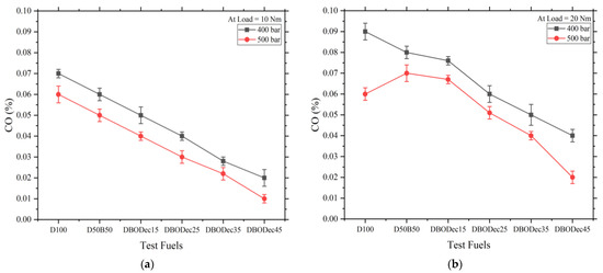 The effect of changes in IP on CO emissions of CRDI diesel engines at both the loads are depicted in Figure 8a,b, respectively. The increment in the injection pressure led to a reduction in CO emissions. The concentration of CO was maximum for diesel for all IPs and loads. The quaternary fuels showed a decrement in CO emission at varied IPs and loads. At a lower IP and lower load, the lowest CO concentration among the quaternary blends was reported for DBODec45 and was obtained to be 71.42% less than D100. The highest oxygen content in the blend prevented partial combustion. However, the maximum CO emission among the quaternary blends was noted for DBODec15, which was 28.57% lesser than D100. This effect was due to the higher viscosity of DBODec15, which caused incomplete combustion. At 500 bar and 10 Nm load, DBODec45 and DBODec15 led with 83.33% and 33% less CO emissions than diesel, respectively. It was also reported from the experiments that the CO emission increased with the increase in load for most of the samples except D100 at 500 bar, and this increase was maximum for DBODec45. Similar outcomes were observed by Appavu et al. [21]. At 400 bar and 20 Nm, DBODec45 showed the least CO emission, which was found to be 55.4% lower than D100. At a higher IP and higher load, a similar trend was observed for the quaternary blends, where DBODec45 resulted in minimum CO emission, which was 66.7% lower than D100, and the maximum CO emission was shown by DBODec15, which was just 11.6% lower than D100. The effect of increment in the injection pressure was most effective in the case of diesel and DBODec45 at the 20 Nm load. This was because the atomization, spray formation, and combustion improved at high IP. These results are found to be in agreement with Saridemir et al. [23]. Moreover, DBODec45 shows behavior similar to that of D100. The CO emissions were reduced with the increase in decanol content at various IPs and loads. For example, DBODec15, DBODec25, and DBODec35 resulted in 59.8%, 50%, and 28.5% higher CO concentration than DBODec45. Moreover, the quaternary fuels led to lesser CO emission as compared to D50B50 at different loads; for example, DBODec45 resulted in a maximum CO reduction of 80% as compared to D50B50. The inclusion of decanol enhanced the oxygen content, which prevented partial combustion.