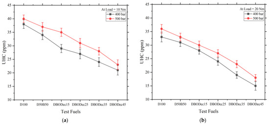 The influence of increment in IP on UHC concentrations of CRDI diesel engines at both the loads is depicted in Figure 9a,b, respectively. The UHC emission increases with an increase in the injection pressure at both loads. The highest value of UHC emission was obtained for diesel at different injection pressures and loads. Among the quaternary blends, a decreasing trend was observed for UHC emission as the volumetric content of decanol increased in the mixtures. The presence of decanol enhanced the oxygen molecules available for combustion, and thus, even the un-burnt fuel droplets were combusted. The highest and lowest UHC concentrations were observed for DBODec15 and DBODec45, which were found to be 23.68% and 44.73% less than diesel, respectively, at 400 bar and 10 Nm load. The high volumetric proportion of decanol offered a high calorific value, which released sufficient heat energy that favored the complete burning of the air–fuel mixture. Similarly, at 500 bar and 10 Nm load, the highest and lowest UHC concentrations were reported for DBODec15 and DBODec45, which were obtained as 12.5% and 42.5% less than diesel, respectively. The maximum reduction in UHC was reported at the lower IP of 400 bar for DBODec45 at 10 Nm load. However, at 400 bar and 20 Nm load, the highest UHC emission among the quaternary blends was reported for DBODec15, which was 15.2% less than diesel, and the lowest UHC concentration was reported for DBODec45, which was observed to be 54.5% less than diesel. However, this reduction in UHC was found to be 16.66% and 50.0% for DBODec15 and DBODec45, respectively, in comparison to diesel, at 500 bar and higher load. It is evident from Figure 9 that the mitigation of UHC can be attained by lowering the injection pressure at a constant engine load. The effect of increase in IP was found to be similar for D100 and DBODec45 at all loads. The increment in UHC emission for D100 and DBODec45 at 10 Nm load was found to be 2 ppm, whereas this increase was found to be 3 ppm at the higher load. The results are in agreement with the findings of Saridemir et al. [23]. The influence of variation in IP was highest for DBODec15 at the lower load and for DBODec35 at the higher load. At high IP, some fuel droplets impinge to the farthest location on the cylinder and thus are unable to combust. Thus, the addition of 45% of decanol proved to be a promising step in reducing UHC emission at all engine loads.