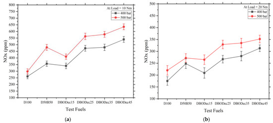 The effects of increment in IP on NOx emissions of a CRDI diesel engine at both the loads are depicted in Figure 10a,b, respectively. The NOx values increased at higher IP for all test fuel samples at both the loading conditions. The high-pressure fuel, due to higher IP, resulted in better atomization and distribution of the fuel droplets in the combustion chamber, which favored high combustion rates. Therefore, the ICT was increased, which triggered more NOx formation. The minimum concentration of NOx emissions was observed for diesel at all injection pressure and loads. The quaternary fuels led to higher NOx emissions as compared to diesel, and a similar finding was reported by Yesilyurt et al. [28]. The NOx emissions increased with increments in the decanol content in the quaternary mixtures. Thus, at 400 bar and a lower load, the least NOx was obtained by DBODec15 among the quaternary blends, which was just 30.26% higher than diesel, but maximum NOx was obtained for DBODec45, which was 51.6% higher than D100. The reduction in NOx emission shown by DBODec15 is due to a lesser oxygen content than DBODec45, which ultimately prevented abrupt combustion rates and a sharp rise in the in-cylinder temperature. Similarly, at higher IP and higher load, the NOx emissions for DBODec15 and DBODec45 were higher by 37.5% and 53.1% than D100. This was because of controlled combustion on account of the uniform heat distribution at higher loads, which maintained low ICT. These outcomes are in concordance with the results of Saridemir et al. [23]. At 400 bar and 20 Nm load, the minimum and maximum NOx emissions were obtained by DBODec15 and DBODec45, which were 19.4% and 78.8% higher than diesel, respectively. A similar trend was reported at 500 bar and 20 Nm, as DBODec15 and DBODec45 led with 20.4% and 60.0% higher NOx emissions than diesel. Therefore, in order to achieve low NOx emission, the CI engine can be operated at a low IP and high engine load. However, the increment in the NOx emissions with increase in IP at 20 Nm load for D100 and DBODec15 was comparable by 45 ppm and 56 ppm, respectively. The quaternary blends, except for DBODec15, showed higher NOx emission than D50B50 at both IPs and varied loads. For example, DBODec15 was observed to be 15.7% less than that of D50B50 at 400 bar and 20 Nm load. Therefore, the up to 15% inclusion of decanol in the quaternary blends can offer considerably a low NOx concentration at low IPs. This is because the addition of a low volume of decanol in the blends slightly increased the oxygen content, which caused controlled combustion and low ICT, thereby limiting the NOx formation.