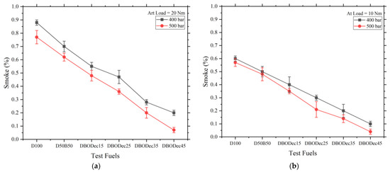 The effects of variation of IP on the smoke emissions of a CRDI diesel engine at both the loads are shown in Figure 11a,b, respectively. The smoke formation decreases with increment in injection pressure irrespective of loads. The increment in the injection pressure reduced the smoke emission because at high IP, intermixing and atomization were improved; moreover, the fuel distribution was uniform throughout the engine cylinder. However, the smoke opacity for quaternary blends was reduced with increments in the quantity of decanol. The highest concentration of smoke was noted for diesel at various injection pressure and loads. At lower IP and lower load, the maximum smoke amount was reported for DBODec15, and the minimum was obtained for DBODec45 among all quaternary blends, which were 33.2% and 83.3% less than diesel. The high volumetric content of decanol resulted in complete combustion, thereby reducing smoke emission. A similar trend was noted at higher injection pressure and 10 Nm load, where DBODec15 resulted in only 38.5% less smoke than D100, and DBODec45 resulted in 92.9% less smoke than D100. It was recorded that the smoke opacity increased at higher loads. This was due to increased injection quantity at higher loads. Similar outcomes were reported by Karthic et al. [22]. At 400 bar and 20 Nm load, the greatest amount of smoke was obtained for DBODec15, which was only 37.5% less than diesel, and the minimum was obtained for DBODec45, which was 77.2% less than diesel. Similarly, at high IP and high load, DBODec15 and DBODec45 led with 37.6% and 90.9% lower smoke opacity than D100. However, the decrement in smoke concentration with increase in injection pressure at both the loads was comparable for D100 and DBODec45. For example, with the increase in IP at 10 Nm load, the decrement in smoke for D100 and DBODec45 was 0.03% and 0.06%, respectively. However, the maximum deviation was observed for DBODec25, which was found to be 13.1%. Additionally, the smoke opacity of D50B50 was 20% higher than DBODec45. The quaternary blends offered a sufficient number of oxygen molecules for combustion, which favored cleaner combustion, resulting in lower smoke emission than diesel and D50B50. Therefore, the use of decanol as a fuel additive in proportions up to 45% can prove to be significant in reducing smoke opacity.