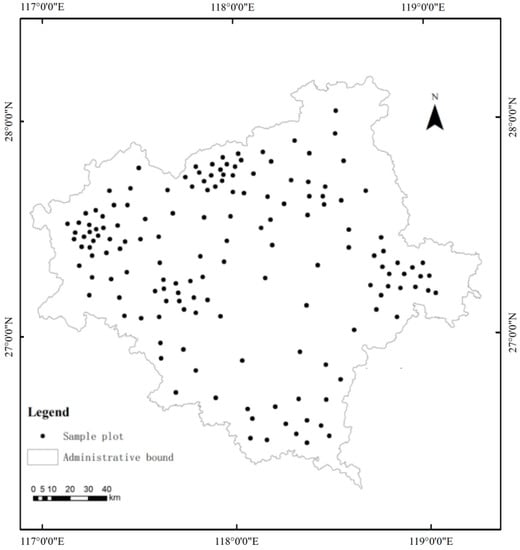 In this study, the Cunninghamia lanceolata timber forest in Nanping City, Fujian Province was taken as the research object. Data was collected from the forest resource fixed sample plot, temporary sample plot, and sample wood timber plot, including the forest site quality grade (SI), average diameter at breast height (D), average height (H), density (SD), stock volume (M), and wood yield (P), etc. Among them, SI contained four grades, i.e., fertile (I), more fertile (II), moderately fertile (III), and barren (IV). According to the statistics, a total of 162 Cunninghamia lanceolata sample plots were collected, as shown in Table 1. The plot distribution points are shown in Figure 1.