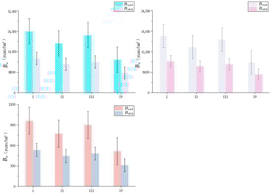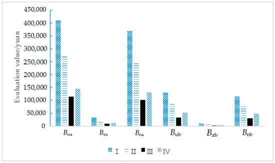 Figure 3 shows that the values of Buad, Bzad, and Bnad were greater than the values of Bubd, Bzbd, and Bnbd. In addition, the values of Buad, Bzad, and Bnad increased with the forest site quality grade, which was consistent with the change trend of the total assessment values. As the forest site quality grade increased, the values of Bu, Bz, and Bn all decreased with the exception for III. This was mainly due to the fact that the factors closely related to forest land evaluation in Site III such as accumulation per unit area and average diameter at breast height were higher than other site quality grades of Sites II and IV, and thus the evaluation results were greater than that of Sites II and IV. However, the change patterns of the results obtained by the two calculation methods were found to be consistent, indicating that the results obtained by the comprehensive mathematics of the forest land net present value are credible in the change trends of the assessment values.