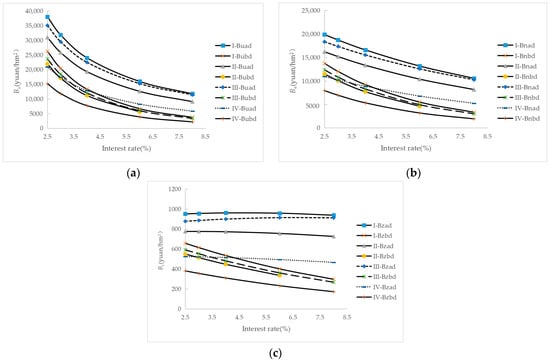 Changes in the evaluation value of the forest land assets calculated by the extended model of forest land return price under different interest rates:(a) Bu value; (b) Bn value; (c) Bz value.
