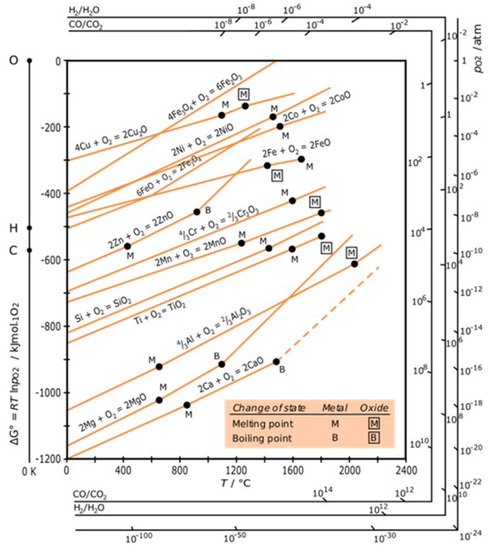 - Ellingham, H.J. Reducibility of oxides and sulphides in metallurgical processes. J. Soc. Chem. Ind. 1944, 63, 125–160. [Google Scholar]
