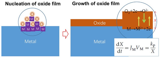 Schematic diagram of nucleation and growth of oxide film on metal surface.