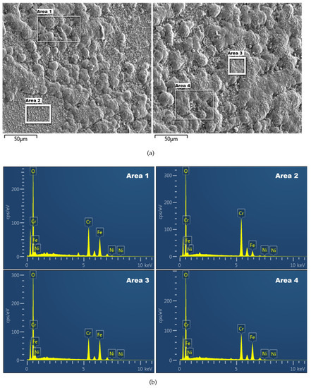 As presented in Figure 6, the XRD analysis results indicated that the metal surface layer predominantly generated two types of oxides, Cr2O3 and Ni (Cr2O4). The formation of this oxide film could effectively mitigate the corrosion rate.