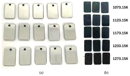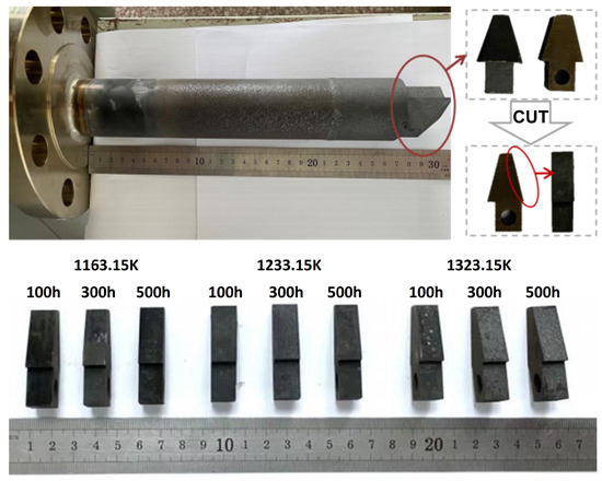 To conduct the mechanistic consistency tests, we selected three stations to analyze the instruments at 1163.15 K, 1233.15 K, and 1323.15 K (in air). In order to clarify the oxidation corrosion process of the alloy at a specific temperature, samples were analyzed after 100 h, 300 h, and 500 h of operation. The macroscopic appearance of the alloy sample after oxidation is presented in Figure 7.