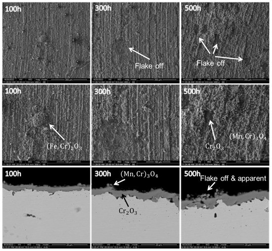 The figure exhibits that the oxidation corrosion of the alloy was relatively severe at this temperature as the surface oxide appeared to exfoliate in large areas in a lamellar manner. The high magnification photograph reveals that the oxide particles in the most superficial layer were significantly shaped, loose, and porous, while the oxide particles in the area after exfoliation were smaller and relatively dense in structure. Upon 300 and 500 h of oxidation, the surface underwent nearly complete exfoliation and regrowth. The cross-sectional morphology demonstrated that the oxide film could be divided into two layers: the inner layer was a uniform and dense dark gray layer, while the outer layer was light gray with a relatively loose structure containing many pores, which is an oxide containing , , and . These observations suggest that the corrosion resistance of the alloy declined as the temperature increased to 1323.15 K. In addition to the formation, the oxidation of and in the alloy also occurred. The crack expansion direction in the oxide film was roughly parallel to the surface, which is consistent with the lamellar exfoliation structure observed in its surface morphology and indicated the periodic behavior of the alloy surface oxide film exfoliation and regeneration during the oxidation process.