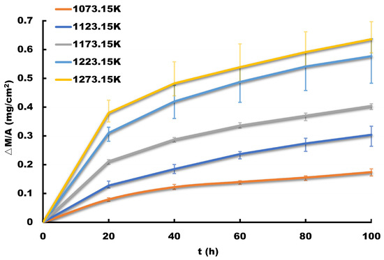For the test, we selected five temperature gradients of 1073.15 K, 1123.15 K, 1173.15 K, 1233.15 K, and 1273.15 K (in air), as Figure 11b shows. The samples were weighed every 20 h for a total of 100 h. Figure 12 shows the weight gain data of each sample divided by its surface area.