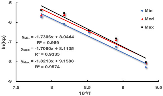 To obtain three quantitative models between the corrosion rate and temperature T, the minimum, medium, and maximum weight gain values for each temperature step were modeled and calculated, as listed in Table 6. The fitting deviation R2 of all three curves was found to be not less than 90%, as shown in Figure 14.