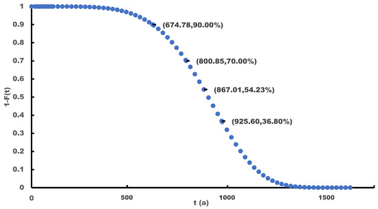 Consequently, the reliability function of the material at different stress level is established based on Equation (7), and the lifetime of the samples at each level with varying values of reliability can be obtained, such as , , and (the characteristic life), as shown in Table 8 and Figure 15. In addition, denotes the transformed lifetime data in Table 4 and denotes the reliability of the traditional corrosion algorithm at the pseudo lifetime, which reveals that the conventional method used in the field of material has a reliability of approximately 50%.