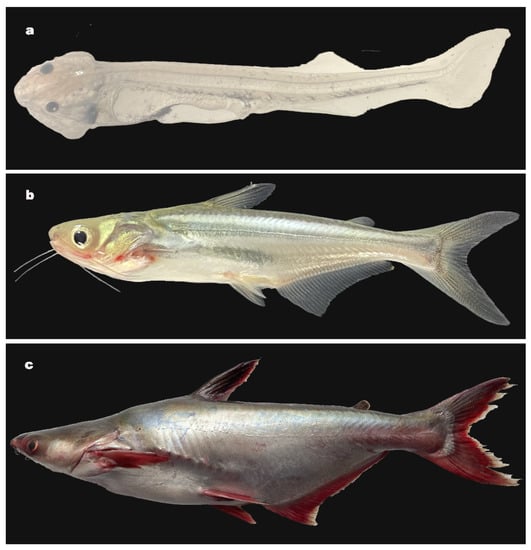 Developmental stages of wild striped catfish: (a) striped catfish larva aged 3 days, 0.5 mm, (b) striped catfish juvenile aged 35 days, 87.0 mm in total length (TL), and (c) adult striped catfish with 570 mm in total length (TL).