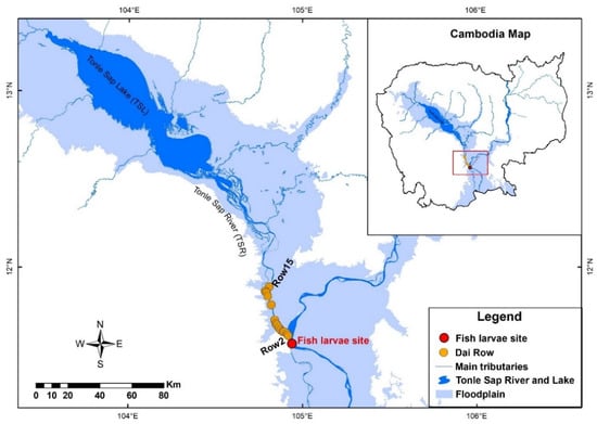 - Chea, T.; Chheng, P.; Thach, P.; Kim, S.; Chin, D.; Sim, T. Monitoring Fish Larvae Abundance and Diversity in the Mekong and Tonle Sap Rivers in Cambodia; Mekong River Commission: Phnom Penh, Cambodia, 2014; p. 46. [Google Scholar]