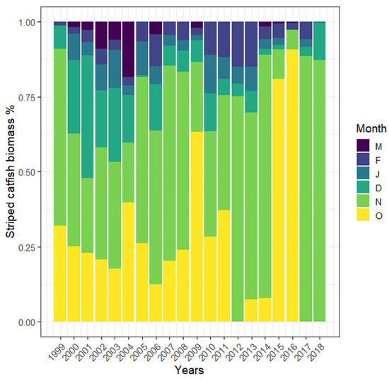Figure 3 shows the proportional catch of the striped catfish (as a percentage of the total catch of all species combined) during the fishing season between October and March from 1998/99 to 2017/18. Relatively more striped catfishes were caught during the first two months of the fishing season (e.g., in October and November) than later in the fishing season (Figure 3). October and November striped catfish catches contributed to 50 to 90% of the catch for the whole fishing season from October to March.